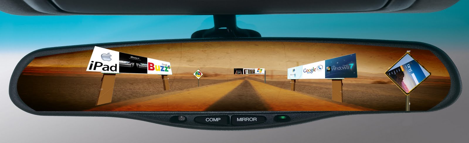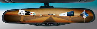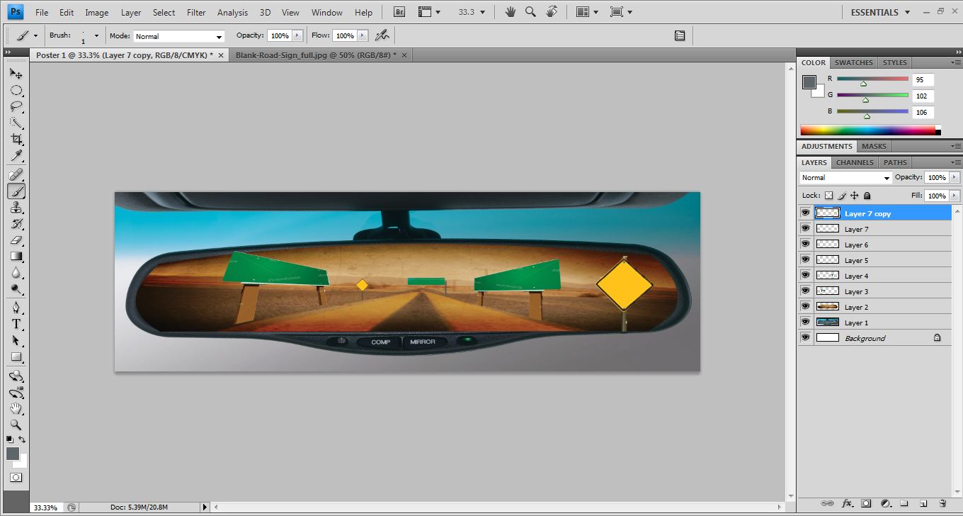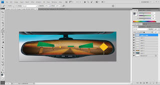 For the second I use the idea of the rear view mirror of the car which looks familiar for all people and give a glance about the path that been gone by us. I use some road regular element like bill boards and signs to put the pictures in.